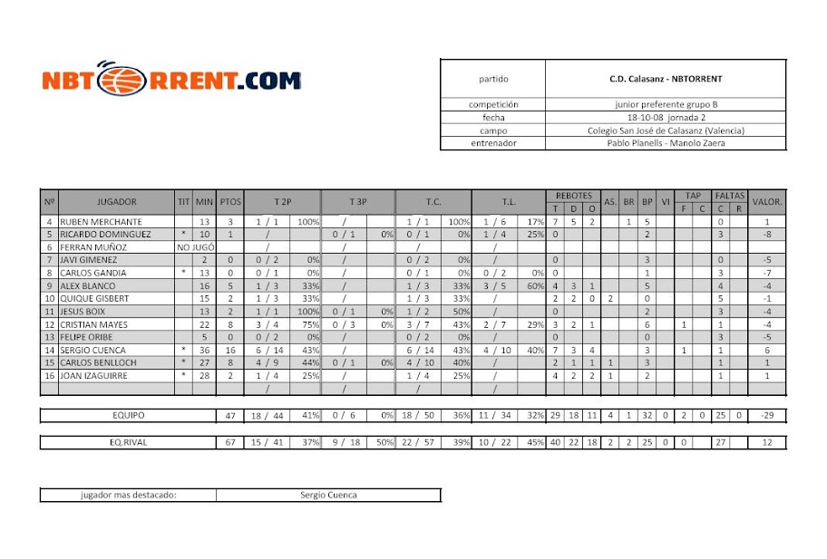 El Júnior va desperdiciar una bona ocasió per a sumar la seua primera victòria davant d’un San José de Calasanz, que amb un 60% en tirs de tres (6 encistellats) va trencar el partit en la primera part. La segona mitat el NBTORRENT va augmentar el nivell defensiu i va aconseguir més canastes fàcils que ens aproximaven a poc a poc al marcador. Però ens va pesar molt el primer parcial i no vam poder igualar més el tanteig.